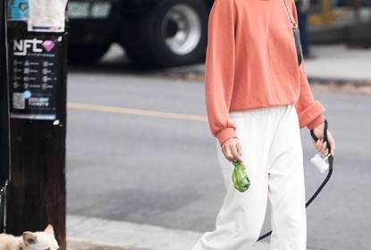 美国加州洛杉矶,模特凯雅·杰柏一身休闲打扮现身街头遛爱犬Milo...