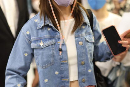 上海闵行区,虹桥机场,蔡卓妍头戴遮阳草帽,口罩遮面,身穿牛仔...