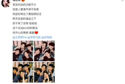 杨丞琳在微博晒出最新合照,并表示是和王霏霏、李斯丹妮、周笔畅...