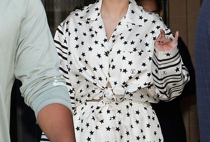 赛琳娜·戈麦斯穿一身星星图案休闲套装现身酒店门口,给等候的粉...