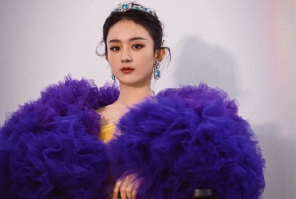 工作室晒出赵丽颖最新写真花絮图,照片中的她身披紫色蓬蓬纱,翎...