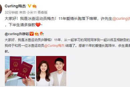 冰壶运动员许静韬在微博晒结婚照,宣布和同为冰壶运动员的女友梅...