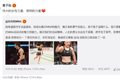 张伟丽赢得UFC终极格斗冠军赛,章子怡在微博为她打call:“伟大的...