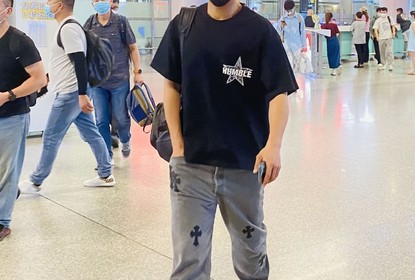 韩东君现身长沙机场。照片中,他身穿黑色T恤搭配牛仔裤,头戴鸭...