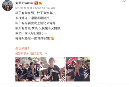 刘畊宏在微博晒出三个孩子照片送上端午祝福,他发文:“粽子有咸...