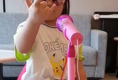 王祖蓝在微博晒出女儿在家唱歌的视频,视频中的gabby戴墨镜手拿...