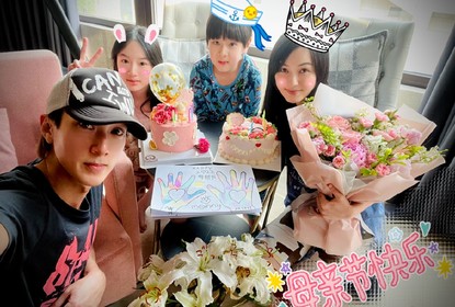 吴尊在微博晒出一家五口庆祝母亲节的照片,他亲自下厨做了一桌大...