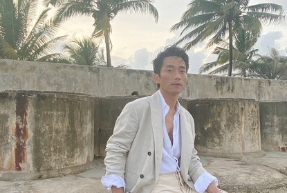 张栋梁在微博晒出一张椰子树下的近照,照片中他身穿白色套装,衬...