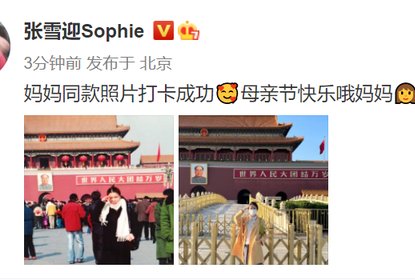 张雪迎晒与妈妈同款天安门打卡照,并配文“母亲节快乐哦妈妈”。照...