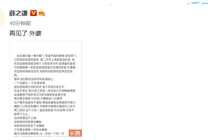 薛之谦在微博发长文透露外婆离世,享年97岁。他还在文中回忆了外...