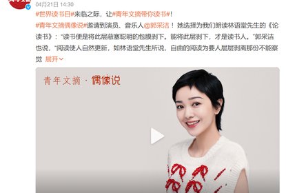 在世界读书日来临之际,《青年文摘》邀请音乐人郭采洁朗读的视频...
