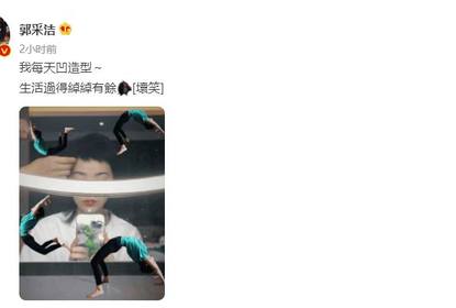 照片中,郭采洁身穿简约白T,对镜自拍时调皮地用补光灯挡住...