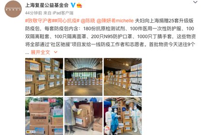 上海复星公益基金会在微博晒出陈晓、陈妍希夫妇向上海捐赠物资的...