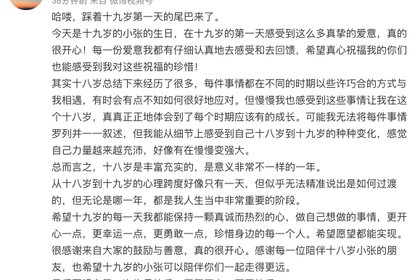 张真源在微博晒出自拍视频合集庆祝自己19岁生日,他还发长文表示...