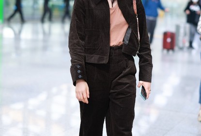 张婧仪现身北京机场,身穿黑色灯芯绒套装简约大气,对镜微笑甜美...