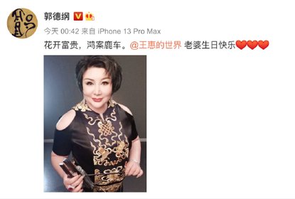 郭德纲老婆王惠的生日。凌晨,郭德纲微博发文为老婆庆生:“花开...
