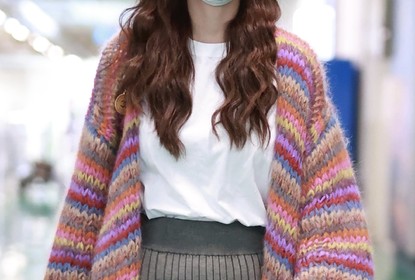沈梦辰穿彩色粗针毛衣现身北京机场,搭配针织开叉裙靓丽时髦。文...