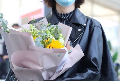 乔欣一身超黑look现身,她身穿黑色皮衣夹克,抱着一束鲜花,面对...