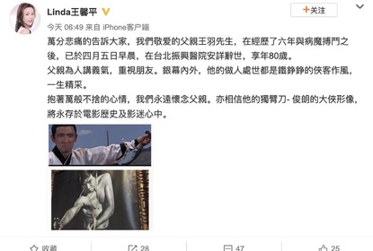 歌手王馨平微博发文称,父亲王羽经历了六年与病魔搏斗之后,最终...
