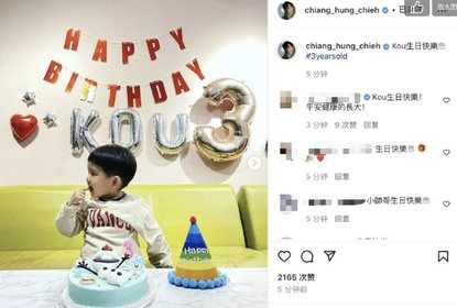 江宏杰在个人社交平台晒出为3岁儿子庆生的照片,Kou君穿着米色卫...