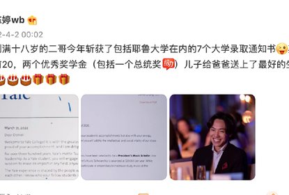 张艺谋妻子陈婷发微博透露,刚满十八岁的二儿子今年斩获了包括耶...