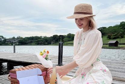 Lisa在社交平台晒出一组春日郊游照,她穿着白色碎花长裙,戴着草...