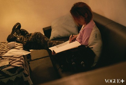 一组易烊千玺长发大片花絮照曝光,照片中他一头黄色中长发尽显野...