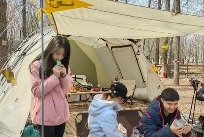 有网友晒出田亮一家外出露营的照片。照片中,森碟穿着粉色外套和...
