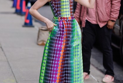 美国纽约,安妮·海瑟薇(AnneHathaway)穿一身彩色规则波点吊带...
