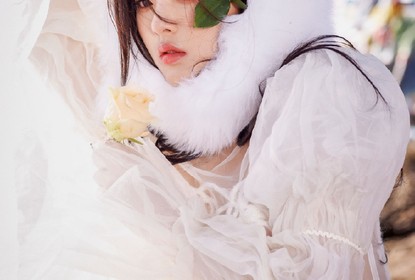 工作室曝光杨超越一组最新大片,照片中的杨超越手捧玫瑰,身着白...