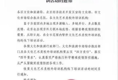 北京市文化和旅游局发出《关于暂停文化艺术类校外培训机构线下培...