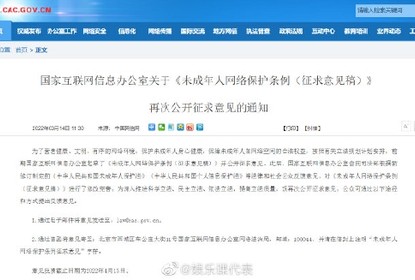 国家互联网信息办公室14日就《未成年人网络保护条例(征求意见稿...