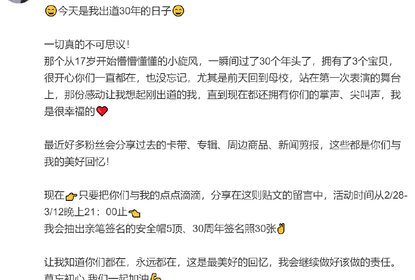 林志颖出道30周年纪念日,他也发微博表达了对粉丝的感激,他写道...
