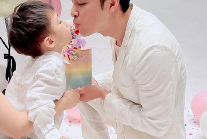 明道42岁生日,明道在微博晒出与儿子贴面合照为自己庆生,配文写...