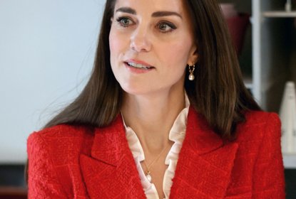 英国凯特王妃到达丹麦哥本哈根。她身穿红色西装外套,内搭荷叶边...