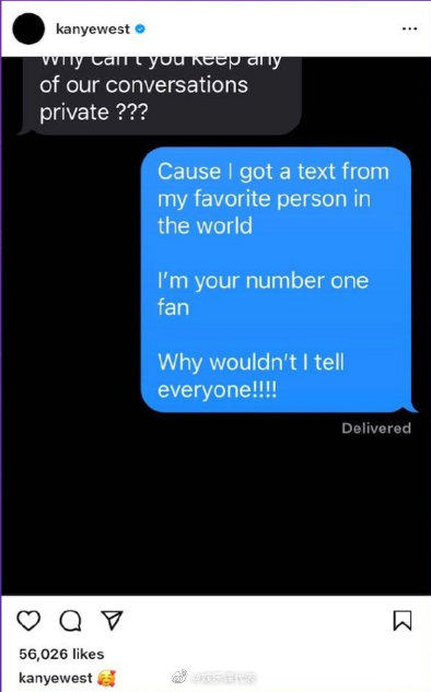 侃爷在社交网站上晒出和前妻卡戴珊的聊天记录。照片中,卡戴珊问...