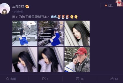 王灿微博晒和杜淳甜蜜合照,配文:“南方的孩子看见雪就开心。”照...
