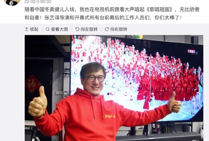 成龙微博发文晒观看冬奥开幕式照片,配文表示:“随着中国冬奥健...