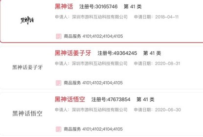商标信息查询网站显示,《黑神话:悟空》的开发商游戏科学注册申...