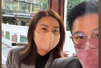 霍启刚在IG上更新一张与郭晶晶的自拍,两人都戴着粉色系的口罩,...
