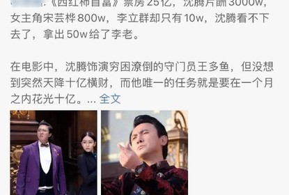 近日,有娱乐博主发文称“李立群在《西红市首富》中片酬为10w,沈...