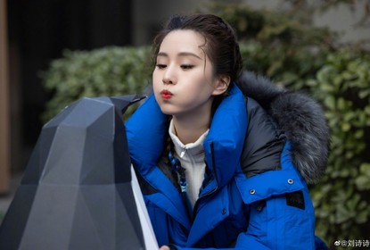 刘诗诗在微博晒出自己工作花絮照,照片中的她身穿蓝色羽绒服,扎...
