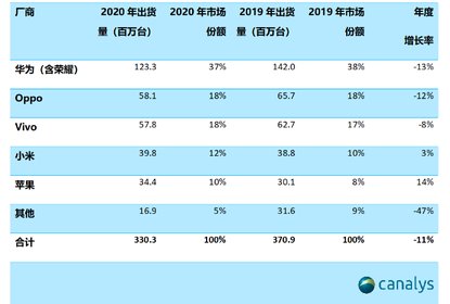 Canalys报告显示,中国大陆智能手机市场2020年第四季度出货量达...