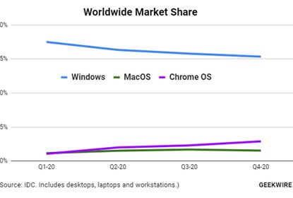据IDC数据,在2020年,ChromeBook的销量首度超过了Mac,成为了占...