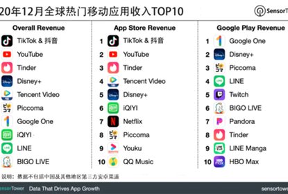 根据SensorTower商店情报数据,2020年12月抖音及海外版TikTok在...