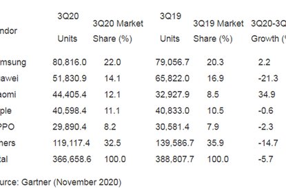 市场调研机构Gartner给出了2020年第三季度智能手机全球销量,三...