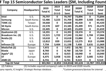 ICInsights最新公告显示,到2020年,排名前15的半导体供应商中,...