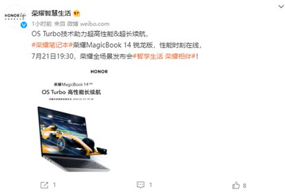 今天,荣耀智慧生活官方宣布,荣耀MagicBook14锐龙版将在7月21日...