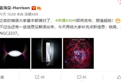 荣耀终端有限公司中国区CMO姜海荣宣布,荣耀X40i即将发布,颜值...