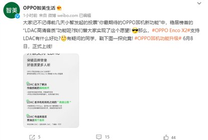 不久前,OPPO官方发起“你最期待的OPPO耳机新功能”投票,LDAC高清...